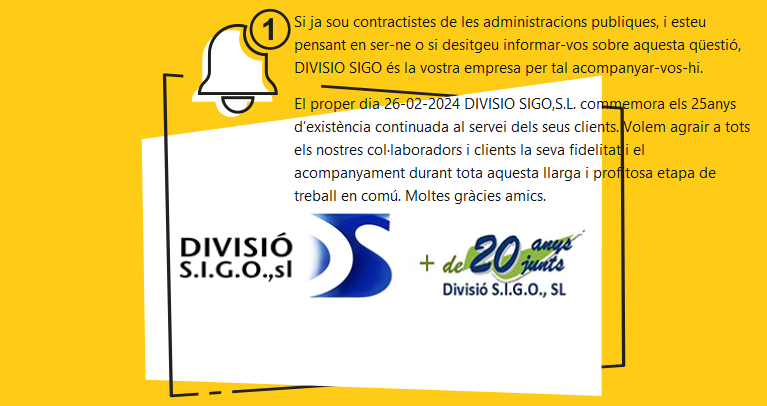 En tant que empresa assessors de varis gremis (Gremi de Constructors de Barcelona i comarques, entre ells) els voldríem recordar que la nostra funció també es la de proporcionar informació al respecte del tema de la contractació pública i és en aquest sentit que us volem dir que tant si ja sou contractistes de les administracions publiques, esteu pensant en ser-ne o si desitgeu informar-vos sobre aquesta qüestió, DIVISIO SIGO és la vostra empresa per tal acompanyar-vos-hi convenientment puix aquests 25 anys d'experiència ens avalen.